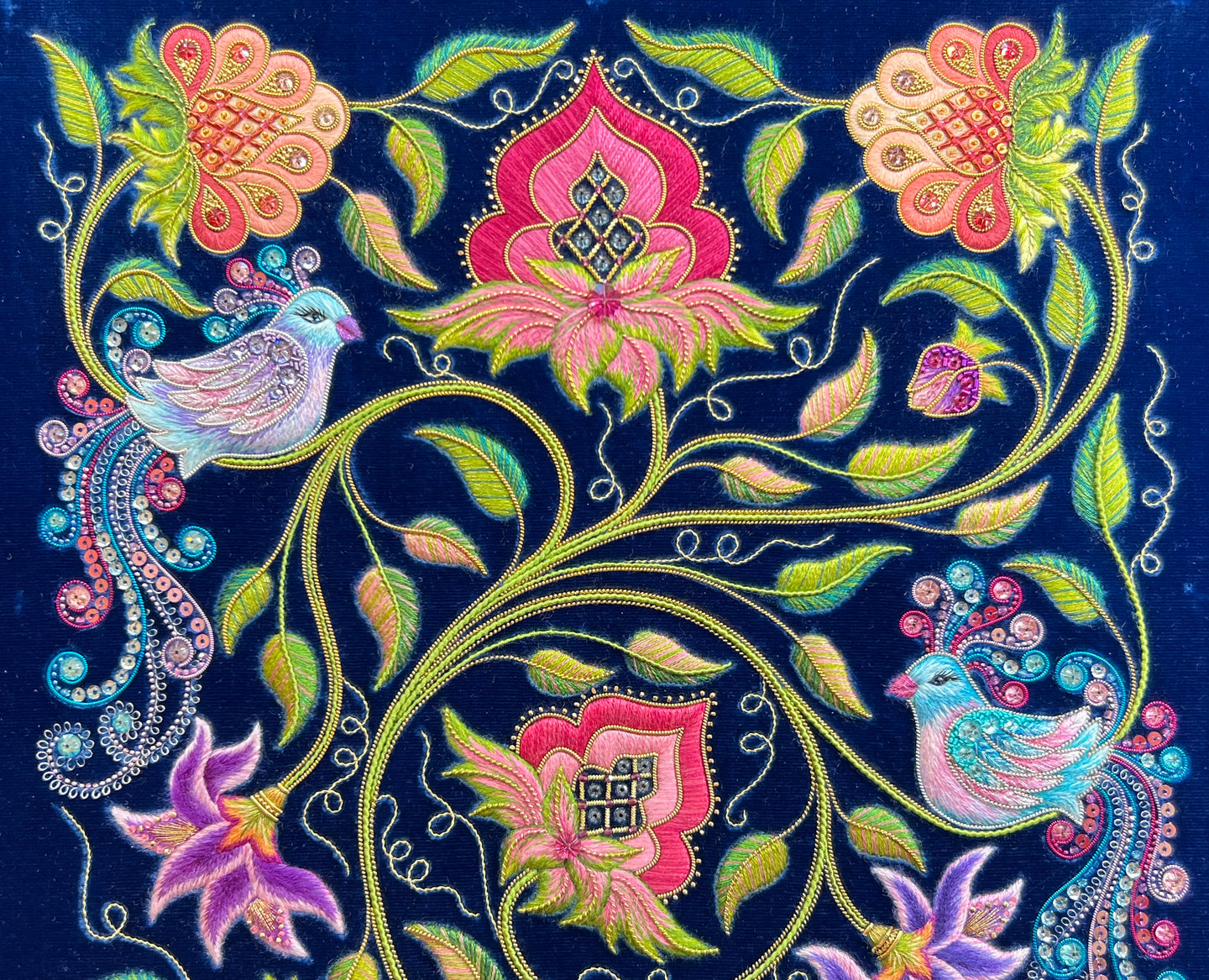 I started working on Nightbirds in 2021. The design began as an image in my mind of two fantastical birds in a magical forest, lit by moonlight. When I was a girl, I used to doodle imaginary birds all the time. The birds in this design are an extension of that...